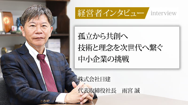 建設機械のアタッチメント製造・販売、そして日立建機の指定販売店として山梨県を拠点に事業を展開する株式会社日建。同社は、大企業から受け継いだ高い技術力を強みに、顧客の細かな要望に応えるものづくりを徹底している。二代目社長として同社を率いる雨宮誠氏は、「人に生かされている」という信念のもと、業界全体が孤立しがちな現状を変えるため、新たなビジネスモデルの構築に挑戦中だ。今回は、キャリアの道のり、人生観を変えた転機、そして日本の未来を見据えた今後の展望について、詳しく話をうかがった。