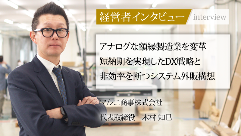 額縁の製造販売を手がけるマルニ商事株式会社。同社は、IT企業出身の代表取締役、木村知巳社長のもと、伝統的な製造業の常識を覆した。業界に先駆けてEC化とDXを推進し、これにより仕入中心の小売業から製造販売へとビジネスモデルの転換を成功させたのである。その結果、受注からわずか3〜4日で額縁を製造し、納品を可能にする圧倒的な競争力を獲得した。アナログな額縁製造業の枠を超え、「最終的にはIT会社になりたい」と語る木村社長に、その軌跡と未来へのビジョンを聞いた。