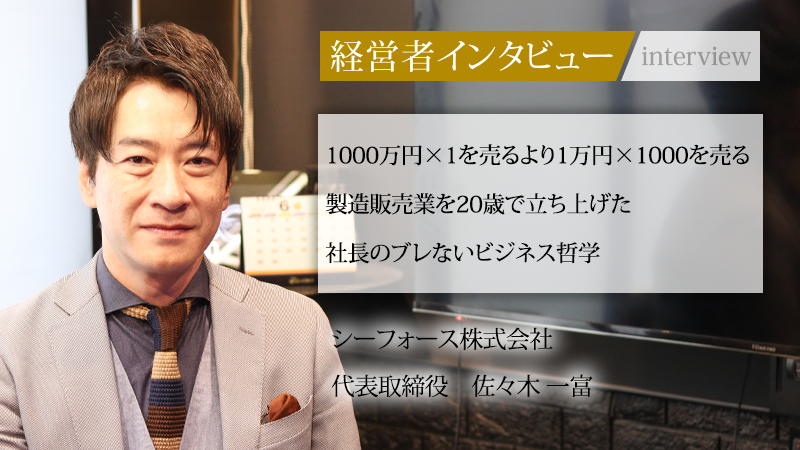 「シーフォース株式会社」はレーザー機器をはじめとする産業機器の開発・製造・販売から、個人向けの各種作業工具の店頭販売までを幅広く手がける東京下町の企業だ。代表取締役の佐々木一富氏は、商品知識ゼロの状態から起業し、25年で精密機器の開発製造まで手がける会社へと成長させた。「悩まない」「深く考えない」という、社長の超ポジティブなマインドセットに迫る。