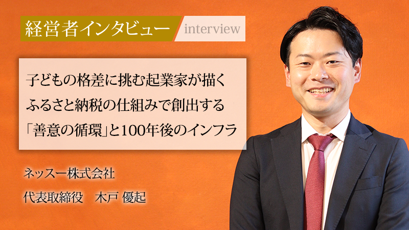 ふるさと納税の仕組みを活用し、子どもの格差解消に挑むネッスー株式会社。同社が展開する「こどもふるさと便」は、寄付者が返礼品を通常通りに受け取りながら、自身の税金の使い道を「どの地域の、どんな困難を抱える子どもたちに、何を届けるか」まで具体的に指定できる画期的なサービスである。幼少期の原体験から「生まれた環境による格差をなくしたい」と強く志した代表取締役の木戸優起氏。法務官僚の夢、大手広告代理店への挑戦、商社や戦略コンサルでの修業を経て、社会課題を事業で解決する道を選んだ同氏に、創業の原点から事業の独自性、そして支援の循環が生まれる未来への展望を聞いた。
