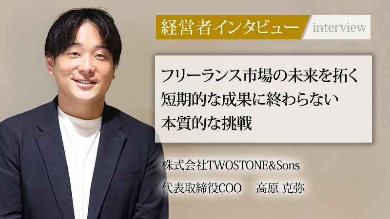 ITフリーランスのマッチング事業を主軸に成長する株式会社TWOSTONE&Sons。人材マッチングのみに留まらず、コンサルティング領域への進出や、M&Aを駆使し企業の成長を一貫して支援している。同社を率いる代表取締役COO 高原 克弥氏は、学生時代に起業し、組織の9割以上が離脱する危機を経験した。その壮絶な原体験から得た学びと、10年先を見据える経営視点に迫る。