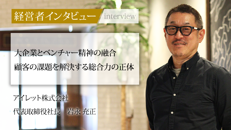 岩永充正/1972年11月生まれ。大学を卒業後、携帯電話自由化の流れから市場有望性が高いと考えて、KDDI株式会社(当時DDI)に入社。2017年、アイレットのKDDI子会社化に合わせ、グループ会社としてシナジーを高めるために在籍出向。2020年4月、代表取締役社長に就任。