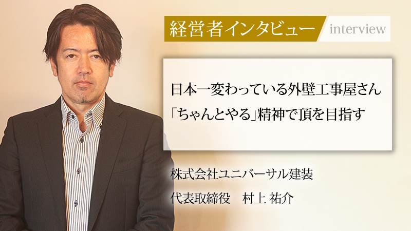 防水・大規模改修工事を主軸に、近年はリノベーション再販事業にも乗り出す株式会社ユニバーサル建装。「ちゃんとやる」という誠実さを武器に顧客からの信頼を獲得し、SNSでは「日本一変わってる外壁工事屋さん」として独自のブランディングを展開している。常に変化を恐れず、10年後の売上高150億円という壮大な目標を掲げる同社。今回、代表取締役の村上祐介氏にこれまでの軌跡と未来への展望について、話をうかがった。