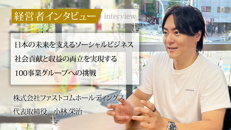 IT・Webマーケティングを基盤に、社会貢献と事業を両立させる株式会社ファストコムホールディングス。同社は建築・建設業向けトータルサポートサービス「建助」やWebソリューション事業などを展開している。現場主義を徹底し、クライアントの本質的な課題解決から地方創生まで幅広く手掛ける。代表取締役の小林栄治氏は、学歴ではなく社会経験で培った「雑草魂」を原動力に、独自の経営論を確立した。100事業のソーシャルビジネスで収益を上げるという壮大な目標を掲げ、日本社会の未来を見据える同氏に、その軌跡と展望をうかがった。