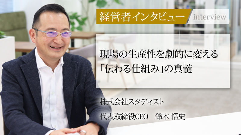 マニュアル作成・共有システム「Teachme Biz(ティーチミー・ビズ)」を軸に、販促実行管理支援などの多様なソリューションを展開し、企業の生産性向上を支援する株式会社スタディスト。画像や動画をベースにしたステップ構造のマニュアルは、作成の手軽さと更新の容易さで多くの支持を集め、国内外で2300社以上が導入している。同社を率いる鈴木悟史氏は、前職時代に直面した課題とリーマンショック後の社会への危機感を原動力に、活力ある社会の実現を目指して起業した。単なるツール提供に留まらず、労働人口減少という社会課題に「リーンオペレーション」という壮大な構想で挑む同氏に、事業の転換点と未来への展望を聞いた。