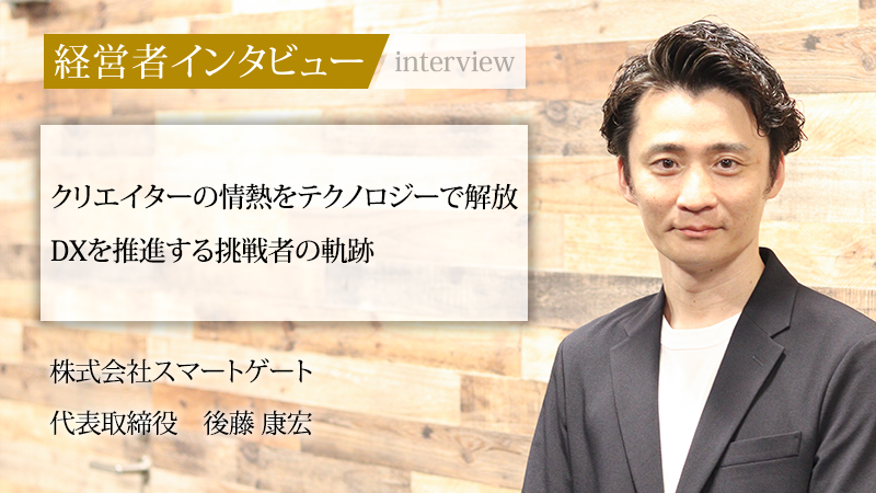 株式会社スマートゲートは、株式会社スマートゲートは、電子書籍制作で業界トップクラスの実績を誇る。取引先1800社、制作実績5万冊以上を達成している。同社を牽引する代表取締役の後藤康宏氏は、「クリエイターの作品を世に広めたい」という強い思いで創業。モバイル広告、リアル広告、コンテンツ制作と多岐にわたる経験を活かし、失敗を恐れぬ挑戦を続けてきた。その姿勢が15期連続での増収増益を実現する原動力である。「日本を代表するクリエイティブテックカンパニーになる」というビジョンを掲げる後藤氏に、これまでの軌跡と今後の展望を聞いた。