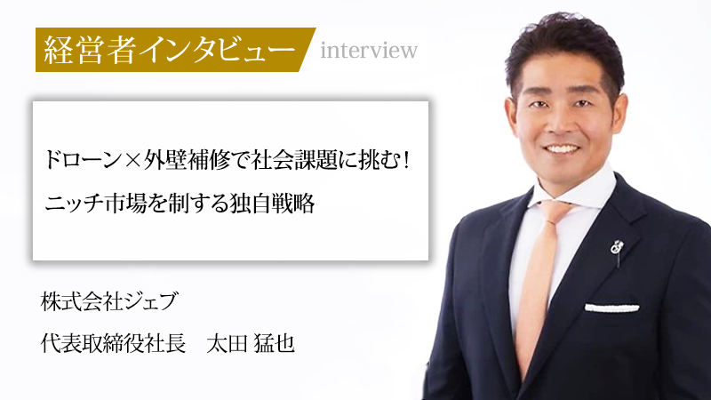 住宅用フロアコーティング事業を主軸に、ドローンを活用した外壁剥落防止事業など、社会課題に直結する新たな挑戦を続ける株式会社ジェブ。同社の強みは、顧客、取引先、そして自社のすべてに利益をもたらす「三方よし」の精神と、徹底して「誠実さ」を貫く独自の営業哲学にある。この揺るぎない価値観は、16歳で社会の厳しさに直面した代表取締役社長、太田猛也氏の原体験から生まれたものだ。現場で叩き込まれた「先読み」の力と、本物を追求する一途な思いがいかにして事業を成長させてきたのか。その軌跡と、2032年の上場、そして孫正義氏をベンチマークに見据える壮大な未来への展望を、太田氏に聞いた。