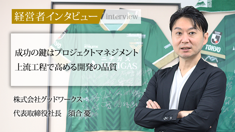 受託開発と教育研修事業を両輪で展開する、株式会社グッドワークス。同社はプロジェクトマネジメントという上流工程に特化した開発力と、未経験者を一流に育てる独自の教育システムを強みとする。その根底にあるのは、代表取締役社長である須合憂氏自身の壮絶な労働体験だ。「若者が夢を諦めずに成長できる、働きやすい『いい会社』を作りたい」という強い思いが、同社を動かしている。その使命感を胸に、2030年の上場と売上100億円企業を目指す同氏に、創業の経緯から事業の強み、そして未来への展望について話を聞いた。
