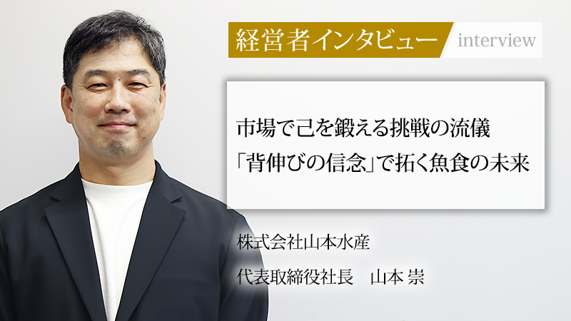 京都市中央卸売市場を拠点に、人々の食卓へ新鮮な魚を届ける株式会社山本水産。代表取締役社長の山本崇氏は、創業者である父と共に二人三脚で事業を発展させ、従業員数を約4倍へと成長させた。その原動力は、若き日に市場で培った「負けたくない」という強い思いと、あえて少し上の目標を掲げる「背伸び」の姿勢にある。競争の激しい市場で、いかに信頼を築き、自らの成長につなげてきたのか。魚食文化の未来や、次世代の若者について語る山本氏に話を聞いた。