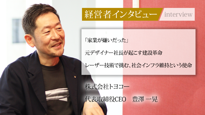 塗装業を祖業としながら、現在はレーザー技術を駆使し、老朽化が進む社会インフラの再生という世界的課題に挑む株式会社トヨコー。同社は独自の工法により、橋梁やプラントといった重要施設の長寿命化を支えている。陣頭指揮を執る代表取締役の豊澤一晃氏は、かつて東京でファッションやデザインの世界に身を置いていた。当初は家業を継ぐ意思はなかったというが、なぜ彼は華やかな世界を離れ、建設業界の道へと進んだのか。本記事では、彼が家業に戻る決意をした背景と、業界の常識を覆す挑戦に懸ける思いに迫る。