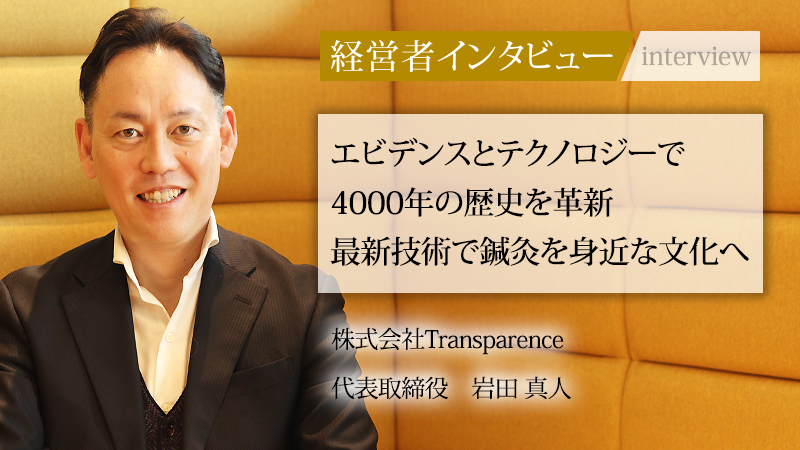 石川県に本社を置く株式会社Transparence。医療機器の輸入販売と、鍼灸院運営という独自の事業モデルを展開している。同社はエビデンスとテクノロジーを軸に、約4000年の歴史を持つ東洋医学の価値を再構築することを目指している。世界中から「本物」の製品や技術を見極めて導入し、ドイツのダーマローラーやフランスのASPニードルをはじめ、新しい試みとして、AIやロボティクスを活用した温灸の自動化にも注力する。古い業界に革新をもたらし、「鍼とお灸を、もっと身近な文化にしたい」と語る代表取締役の岩田真人氏に、その挑戦と未来への展望を聞いた。