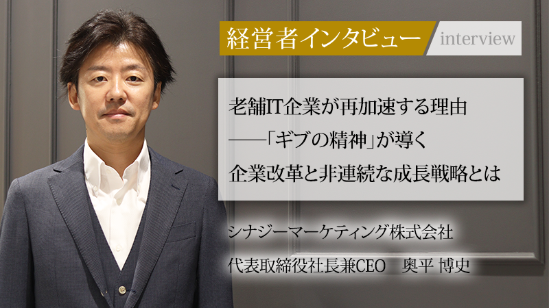 日本のデジタルマーケティング黎明期から、CRM領域のパイオニアとして顧客企業の成長を支え続けてきたシナジーマーケティング株式会社。同社が25年の歴史で培った顧客との関係性と技術力を基盤に、三代目代表取締役社長兼CEOの奥平博史氏が目指すのは「非連続な成長」だ。奥平氏が取り組む現場主義の徹底や「ギブの意識」、そして老舗企業を変革へと導く戦略と2030年に向けたビジョンをうかがった。