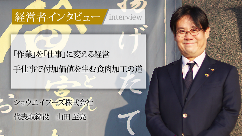 食肉製品の業務用製造を主軸に、とんかつやハンバーグなどを大手飲食店チェーンに供給するショウエイフーズ株式会社。自動化が進む業界において、あえて「手仕事」の工程を残すことで顧客の細かな要望に応え、高い付加価値を生み出す独自の地位を確立している。同社を率いるのは、板前として10年以上のキャリアを積んだ後、30歳で家業を継いだ山田至亮氏。個人商店から企業への変革、社員が誇りを持てる自社ブランドの展開など、独自の取り組みを進める山田氏に、その経営観と未来への展望について話を伺った。