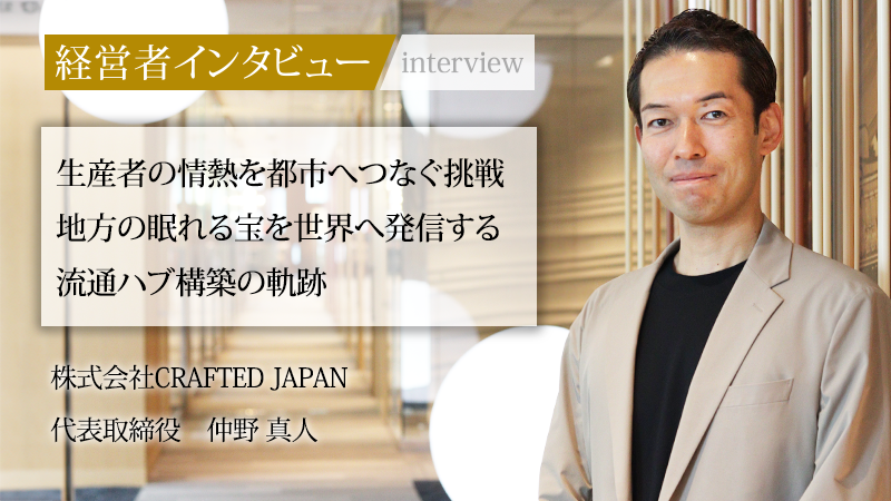 生産者と消費者、そして都市と地方をつなぎ、日本の農林漁業が抱える課題解決に挑む、株式会社CRAFTED JAPAN。「生産者と消費者を物語でつなぐ」をミッションに掲げ、都内での飲食店経営や地方でのビール醸造所の事業承継など、多角的に事業展開している。同社を率いるのは、大手証券会社から食と農林漁業の世界へ転身した経歴を持つ代表取締役の仲野真人氏だ。同世代の生産者たちとの固い絆、そして「誰かがやらなければならない」という強い使命感に突き動かされ、事業に邁進する同氏の信念と、同社が描く日本の食の未来について話を聞いた。