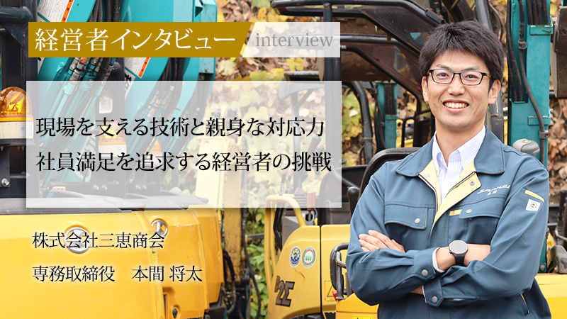 本間将太/1987年神奈川県生まれ。青山学院大学卒業後、みずほ情報総研株式会社(現・みずほリサーチ&テクノロジーズ株式会社)に入社し、システムエンジニアとして勤務する。29歳の時に家業を継ぐことを決意し、建設機械商社へ転職し、4年間営業職として業界経験を積む。2021年に株式会社三恵商会の専務取締役に就任。