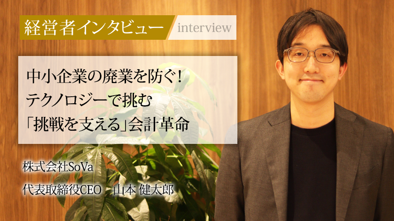 士業とテクノロジーを融合させた会計事務所「SoVa」を運営する株式会社SoVa。同社は「会計事務所版のユニクロ」をコンセプトに、中小企業へ高品質なサービスを圧倒的なコストパフォーマンスで提供する。業界の常識を覆す独自の仕組みと生産性を武器に、急成長を続ける同社の根底には、「安心して挑戦できる社会をつくる」というミッションがある。独自の経営信念で組織を率いる代表取締役社長の山本健太郎氏に、事業にかける思いと今後の展望について伺った。