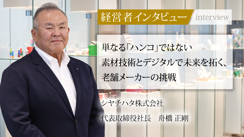 舟橋正剛/1965年愛知県名古屋市生まれ。米リンチバーグ大経営大学院修士課程修了後、広告代理店に入社。主に企業のプロモーションを担当したのち、1997年シヤチハタ株式会社に入社。経営企画やマーケティング部門を経験後、常務、副社長を経て、2006年代表取締役社長に就任。従来のプロダクトの枠にとどまらない商品やデジタル関連サービス、素材ビジネスまで幅広く取り組む。ジャンルにとらわれない「しるしの価値」を追求する。