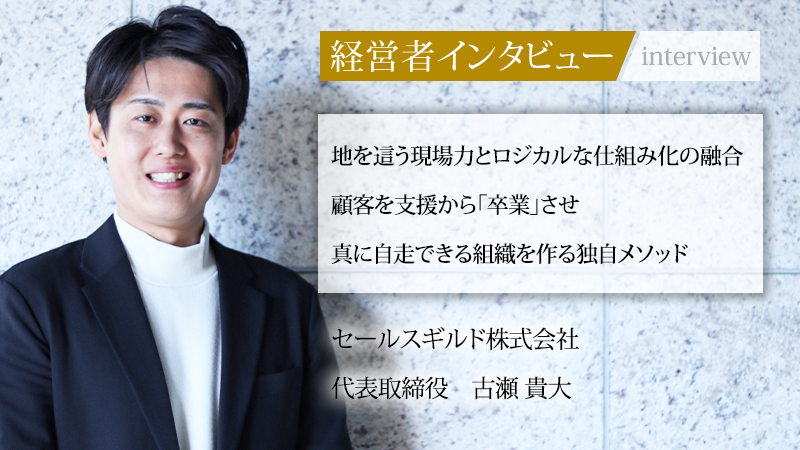 単なる営業代行ではなく、クライアントが自走できる「売れる仕組み」を構築し、最終的に支援から「卒業」させることを目指すセールスギルド株式会社。強みの源泉は、代表取締役の古瀬貴大氏が経験した、気合と根性の新規開拓と、メガベンチャーで学んだロジカルな仕組み化という両極の経験にある。年2倍以上の成長を目指す中で、属人化したフェーズを終え、現在は組織で勝つための変革に挑んでいる。営業を一生モノの武器に変え、業界全体の価値向上を目指す同氏に、独自の事業理念と今後の展望について話を聞いた。