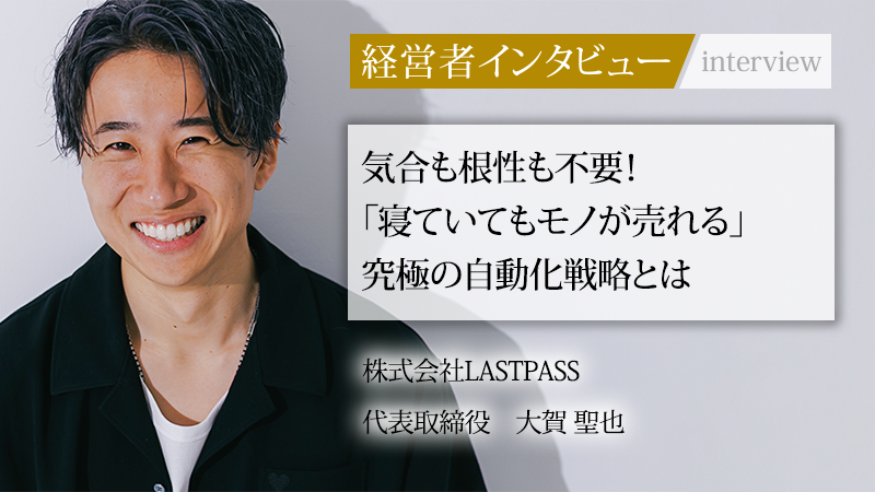 大賀聖也/1993年生まれ。20代前半はフリーターとして過ごし、その後リクルートへ入社。25歳で独立し株式会社LASTPASSを創業。Webマーケティング事業を開始する。現在はSNS広告運用や動画マーケティングを駆使し、企業の売上拡大を支援する傍ら、アパレルブランドの展開なども手がける。目標は年商100億円。