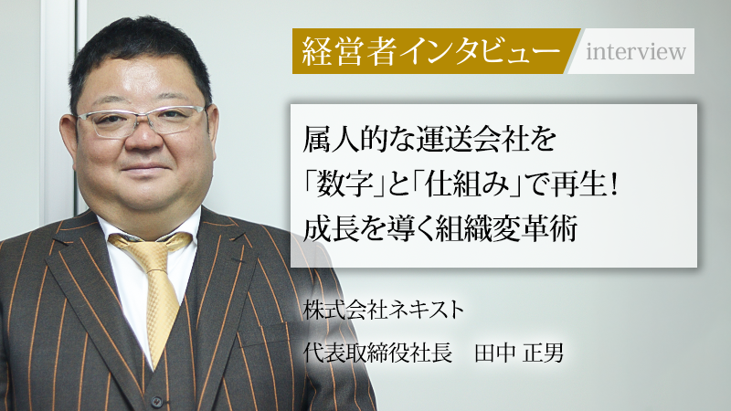 運送事業を中核に、倉庫機能とかけ合わせた全体最適の提案で成長を続ける株式会社ネキスト。同社を牽引する田中正男氏は、理系出身ならではの緻密な数値管理と、泥臭い営業現場で培った対話力を武器に、組織を変革してきた。かつて高いポテンシャルを秘めながらも、組織基盤が未整備だった同社をいかにして再生させたのか。学生時代から抱き続けた「社長になる」という志、人生を変えた上司との「縁」、そして日本全国へその名を轟かせようとする未来への展望に迫る。