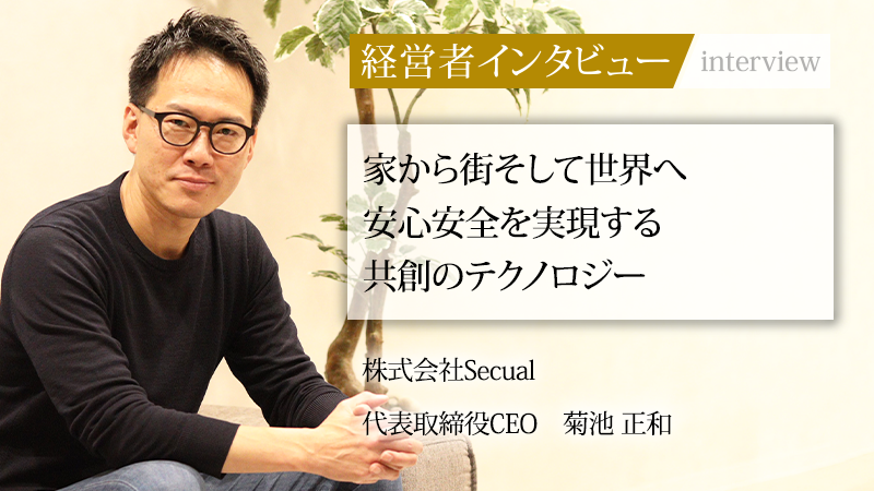 独自のスマートセキュリティ技術を核に、人々の暮らしに安心安全を提供する株式会社Secual。同社は戸建て住宅向けのサービスから事業を開始したが、現在では街全体や自動車領域にまでその範囲を拡大し、「トータルセキュリティカンパニー」としての地位を確立しつつある。既存の街にも後付けで導入可能な技術を開発し、共創によって新たな価値を生み出し続ける姿勢が同社の特徴だ。創業期から事業変革を牽引してきた代表取締役CEOの菊池正和氏に、事業の現在地から未来の展望、そしてともに働きたい仲間への思いを聞いた。