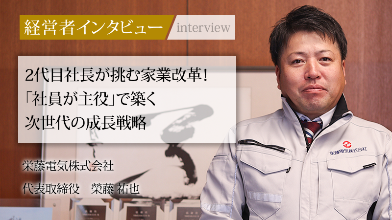 電気設備や空調工事を軸に、公共事業から民間の大規模工事まで幅広く手掛ける栄藤電気株式会社。大手にはない機動力と小規模事業者にはない組織力を強みに、安定した事業基盤を築いている。同社を率いる代表取締役の榮藤祐也氏は、音楽業界でキャリアを積んだ後、家業を継ぐためにUターンしたユニークな経歴の持ち主である。2代目としての逆風を乗り越え、「社員ファースト」の理念のもと、旧来の家業的経営から近代的な企業への改革を実行した。この記事では、社員にとって「働きたい」と思える会社づくりにかける榮藤氏の情熱と、業界の未来を見据えた成長戦略に迫る。