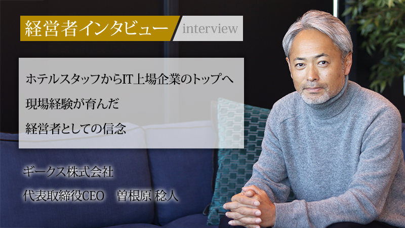 ITフリーランスの働き方を支援し、「IT人材不足」という社会課題の解決に取り組むギークス株式会社。同社は、IT人材不足という社会課題に対し、ITフリーランスを活用し、必要なスキルを必要な期間だけシェアする独自のモデルで成長を続けている。新卒で入社したホテル勤務時代に経営者を志し、不動産業界を経てITの黎明期に創業した代表取締役CEOの曽根原稔人氏。「仕事は趣味の延長だった」と語るサービスマン時代から、泥臭い営業代行を経て上場企業のトップへと駆け上がったその裏には、常に「自身のあり方」を問い続ける独自の美学があった。これまでの軌跡と事業の展望、そして次世代に託す思いについて話を聞いた。