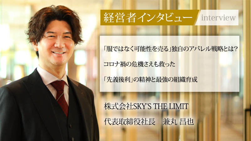 兼丸昌也/1986年長野県生まれ。関東学院大学文学部比較文化学科卒業後、専門商社に入社。営業・事業推進を通じてビジネスの基礎を磨き、転職を経て独立。現在は株式会社SKY’S THE LIMIT代表取締役として、アパレル事業など小売業を中心に事業開発、組織づくり、人材育成を手がける。経営の現場で培った経験をもとに、価値創造と長期視点の経営哲学を発信している。
