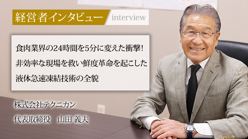 画期的な液体急速凍結技術「凍眠」を開発し、食品の鮮度保持に革命をもたらしてきた株式会社テクニカン。外食産業の現場が抱える課題を解決するために生まれたその技術は、今や一次産業から加工品、さらに日本酒の世界にまで広がり、日本の食文化の可能性を押し広げている。開発者である代表取締役の山田義夫氏は、その発想の源泉を「自然」にあると語る。本記事では、現場の課題解決から生まれた技術の源泉、「良いものを作りたい」と願うすべての人に寄り添う誠実な姿勢、さらに「日本の成功はまだ0(ゼロ)に等しい」と語る、世界市場を見据えた壮大なビジョンに迫る。