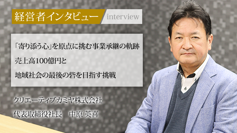 紙おむつの販売事業を基盤としながら、医療・介護・障がい福祉、さらには保険外サービスへと領域を広げるクリエーティブカミヤ株式会社。同社を率いるのは、大手製紙メーカーで29年間勤務した後、事業を承継した代表取締役社長の中原英喜氏だ。東南アジアでの営業活動を通じて学んだ「寄り添う心」を原点に、入社から7年で売上を3倍にまで成長させた。その大胆な組織変革の軌跡と、5年後の売上100億円達成を見据える成長戦略、そして地域社会の「最後の砦」となることを目指す未来像に迫る。
