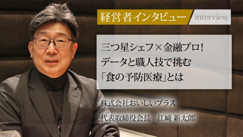 「からだのことを考えながら、ちゃんとおいしい。」をコンセプトに掲げ、「おいしい健康食」を追求し続ける株式会社おいしいプラス。保存料・化学調味料不使用の「無添加」と徹底した「低糖質」にこだわり、伊勢丹や東京駅「グランスタ東京」などの激戦区で行列を作る人気店だ。同社の代表取締役会長の江﨑新太郎氏は、料理人として30年~40年のキャリアを持ち、三つ星シェフとしての技術で糖尿病予備軍から健康を志す人まで、幅広い層を支えている。赤坂の料亭で修行先をつかみ取った原体験から、金融のプロである社長との二人三脚で挑む医療食の革新まで。職人の技術と科学で社会課題に挑む、「闘う料理人」の覚悟に迫った。