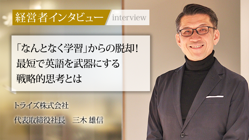 1年間でビジネス英語を習得する英語コーチングプログラム「TORAIZ(トライズ)」を運営する、トライズ株式会社。受講生一人ひとりの課題や目標に徹底的に寄り添う“個別最適化”を最大の強みとし、多忙なビジネスパーソンから本気で英語を話したいと願う多くの人々の支持を集めている。同社を率いる代表取締役社長の三木雄信氏は、かつてソフトバンク株式会社で孫正義氏の社長室長を務めた経歴の持ち主だ。その経験は、どのようにして現在の事業に結実したのか。AIの台頭で英語業界が激変する中、同社が目指す“本当に話せるようになる教育”の本質と、世界で戦う日本人を支えるインフラとしての未来像に迫る。