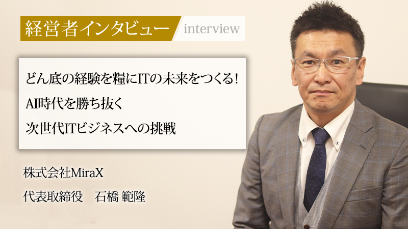 「IT業界に入ったのは興味からではなく、給料が良かったからです」。そう率直に語る石橋範隆氏は現在、株式会社MiraXの代表取締役として、革新的な自社サービスの開発を牽引している。未経験からエンジニアとなり、数々の大規模プロジェクトを経験した同氏は、前職で債務超過2億円という絶望的な状況から会社を救った実績を持つ。石橋氏がいかにして過去の困難を乗り越え、現在次世代のITビジネスをどのように描いているのか、その軌跡と展望に迫った。