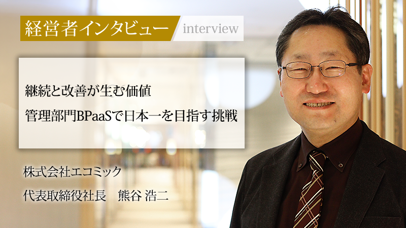 人事部門を中心に、BPO(ビジネス・プロセス・アウトソーシング)とSaaSを組み合わせたBPaaS事業を展開する株式会社エコミック。同社は独自の強みで顧客の業務効率化を支援している。さらに、日本の生産性向上や、災害時の事業継続といった社会課題を解決することにも貢献する。代表取締役社長の熊谷浩二氏は、小学生の頃に抱いた「社長になる」という夢を実現するため、一貫した軸を持ってキャリアを歩んできた。常に前を向き、思い通りにいかない状況さえも成長の糧に変えてきた同氏の経営における信念、そして「管理部門のBPaaSで日本一になる」という確固たる目標を掲げた今後の展望に迫る。