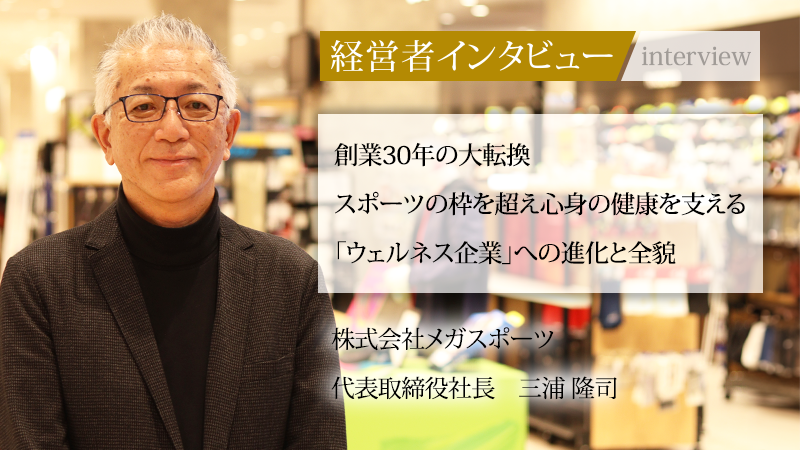 全国にスポーツ専門店を展開し、人々の健康的な生活を支える株式会社メガスポーツ。創業から30年を経て、同社は今、大きな変革の時を迎えている。これまで親しまれてきた店舗ブランド「スポーツオーソリティ」の運営ノウハウを活かしつつ、現在は、社名を冠した「メガスポーツ」への刷新を始動している。スポーツ用品の販売という枠を超え、心身の健やかさをトータルで提案する「ウェルネス企業」への進化を掲げている。自ら手を挙げ、変化を恐れずに挑戦を続けてきた代表取締役社長の三浦隆司氏に、これまでのキャリアと、地域に根ざした新たな成長戦略について話を聞いた。