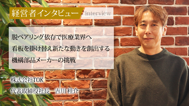 冷蔵庫や机の引き出しをスムーズに開閉するための機構部品の一つ、ベアリング。1938年設立の株式会社TOK(旧:トックベアリング株式会社)は、プラスチック製ベアリングの製品化に国内で初めて成功し、それまで金属製が一般的であったベアリングの常識を覆した、いわばベアリング業界におけるパイオニアである。2017年に社名を変更し、既存製品への依存からの脱却とブランド再構築の決意を固め、新たな目標に向けて歩み出した同社。医療業界への進出など製造業の枠を超えた社会的意義を追求し、独自の「待つ」経営で社員の挑戦を後押しする代表取締役社長、吉川桂介氏に、同社の今後の展望や求める人材などについて話を聞いた。