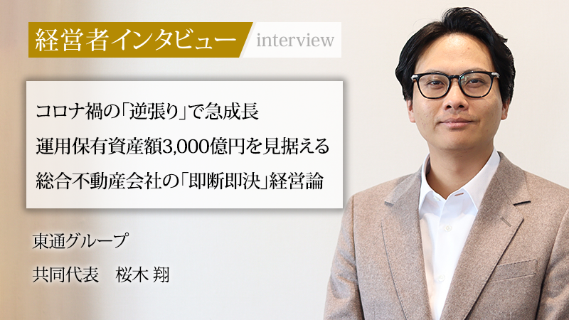 世界中が未曾有の混乱に陥ったコロナ禍で、多くの企業が守りの姿勢をとる中、あえて不動産マーケットへ参入した企業がある。それが東通グループだ。共同代表の桜木翔氏が立ち上げた同社は、彼のビジョンに共感し共同事業として参画したマカオで40年以上の歴史を持つ企業のサポートを得て、不動産市場で迅速な取引を展開し、設立から数年で業界内での地位を確立した。現在は不動産投資にとどまらず、再生や開発、ホテル運営、資産運用へと事業領域を広げている。「自分らしい経営を貫きたい」と語る共同代表の桜木翔氏に、急成長を支える戦略と組織づくりへの思いを聞いた。
