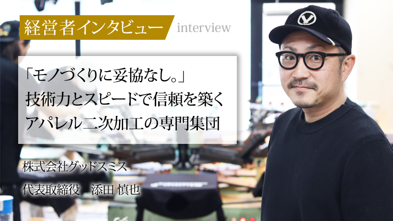 アパレルの二次加工を軸に、ブランドからクリエイター、スポーツチームまで幅広い顧客のものづくりを支える株式会社グッドスミス。同社は「モノづくりに妥協なし。」というスローガンを掲げ、高度な技術力と短納期を武器に成長を遂げてきた。夫婦2人で立ち上げた会社は、現在50名規模の組織へと拡大している。今回は、さまざまな職業を経験した後に独立を果たした代表取締役の添田慎也氏に、同社の強みや人を大切にする経営方針、今後の展望について話をうかがった。
