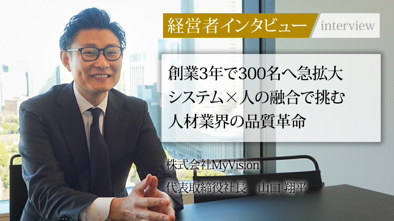 コンサルティング業界の転職に特化し、業界随一の支援実績を持つプロフェッショナル集団、株式会社MyVision。2022年12月の事業開始から3年あまりで、従業員数300名を超える規模へと急成長を遂げている。代表取締役社長の山口翔平氏が目指すのは、コンサルティング業界への転職支援にとどまらない、ハイクラス向け総合エージェントとしての地位確立と、2028年の上場だ。なぜこれほどのスピードで組織を拡大し、質の高いサービスを提供し続けられるのか。山口氏がたどり着いた、人材業界の新たな勝ち筋に迫る。