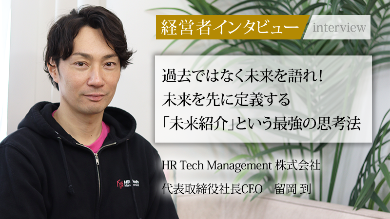 採用コンサルティングや採用支援、人事DXサービスの開発など、多角的な事業展開で急成長を遂げるHR Tech Management 株式会社。「人の活躍する舞台を創り続ける」をミッションに掲げ、顧客企業の課題解決だけでなく、社員が経営者として飛躍できる環境づくりにも注力している。常識にとらわれない発想で事業を生み出し続け、同社を牽引するのが、代表取締役の留岡到氏だ。今回、原点にある強烈な体験と、人生を劇的に変える思考法、そして同社が目指す壮大なビジョンについて話を聞いた。