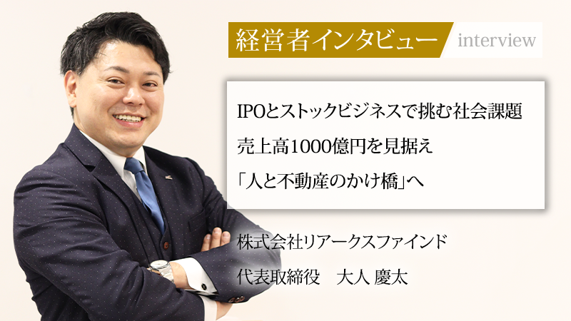 「人と不動産のかけ橋」を企業理念に掲げ、中古マンションの買取再販事業で急成長を遂げる株式会社リアークスファインド。創業からわずか10年余りで売上高100億円を突破する見込みの同社は、業界の常識を覆すプル型営業への転換や、独自の品質基準を設けたリノベーションブランドの展開により、新たな市場価値を創造し続けている。所持金10万円で鹿児島から上京し、トップセールスを経て起業した代表取締役の大人慶太氏は、かつて「金と権力」を求めた野心家だったという。しかし、悩み抜いた末に同氏が辿り着いたのは、「社会に真の価値を生み出す」という確固たる信念だった。新規上場を通過点とし、売上高1000億円企業を目指す同社の成長の源泉と、厳しくも温かい独自の組織文化について、同氏に話を聞いた。