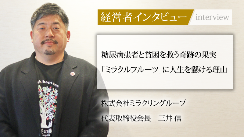 西アフリカ原産の希少植物「ミラクルフルーツ」。酸っぱいものを甘く感じさせるこの果実の特性を活かし、糖尿病患者のQOL向上や貧困支援に取り組む企業がある。大阪に拠点を置く株式会社ミラクリングループ。同社を率いるのは、フィリピンでの事業成功や国内企業の急成長を導いた実績を持つ三井信氏。かつて120億円規模の事業成長を導き、ビジネスの最前線にいた同氏が、なぜ恩師の招へいに応じて未知のフルーツ事業へ飛び込み、その遺志を継ぐ道を選んだのか。世界最大級の農園と大学との共同研究を基盤に、グローバル展開へ挑む同氏に、その壮大なビジョンをうかがった。