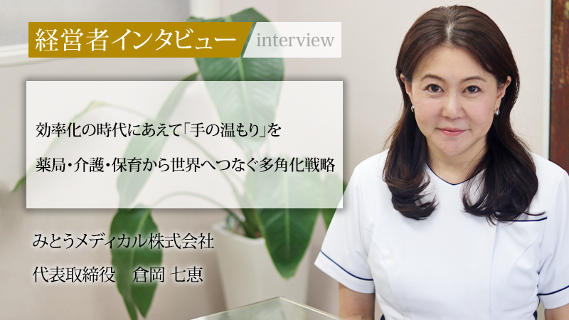 効率化が進む現代の医療業界において、あえて手間を惜しまず、一人ひとりの患者に深く寄り添うことで地域から選ばれ続けているのは、みとうメディカル株式会社だ。同社は薬局事業を起点に、介護、保育、さらには海外人材事業へと多角的な展開を見せている。先代である父との突然の別れから一年足らず。深い悲しみを乗り越えて新たに代表取締役に就任した倉岡七恵氏に、地域医療への熱い思いと組織づくり、そして未来に向けた新たな挑戦について詳しくうかがった。