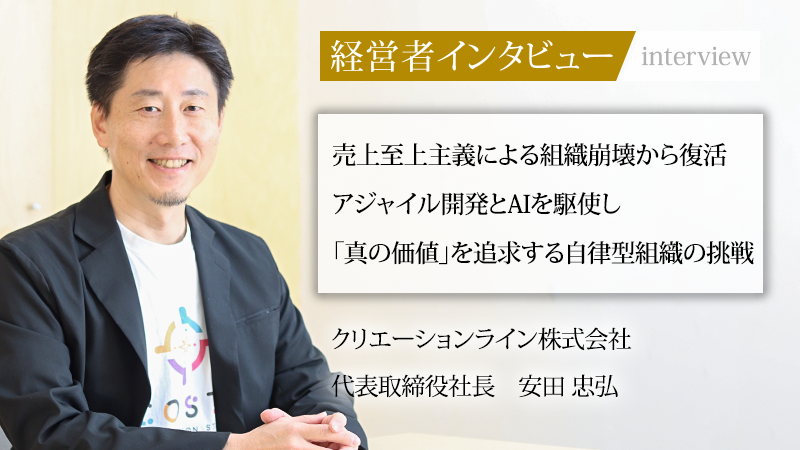 20年以上の歴史を持ち、エンタープライズ企業からスタートアップまで幅広い技術支援を行うクリエーションライン株式会社。かつて「売上至上主義」で組織崩壊の危機に直面した同社は、現在「HRT+Joy(謙虚・尊敬・信頼+楽しさ)」を理念に掲げ、自律型組織へと生まれ変わった。アジャイル開発と生成AIを駆使し、顧客の「真の価値(アウトカム)」を追求し続ける代表取締役社長、安田忠弘氏。これまでの波乱万丈な歩みと未来を懸ける新たな共創事業「COSTA(Co-Creation Startup)」について話をうかがった。