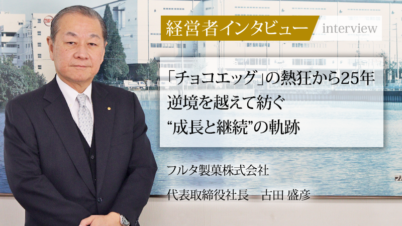 「セコイヤチョコレート」や「チョコエッグ」など、世代を超えて愛される商品を世に送り出してきたフルタ製菓株式会社。同社はチョコレート、ポケット菓子、食玩、業務用の4事業を柱に、BtoB(※1)事業やグループ会社との連携を通じて菓子業界で独自の地位を築いている。創業以来の伝統を守りつつ、時代の変化に対応した挑戦を続ける同社を率いるのが、代表取締役社長の古田盛彦氏である。かつて直面した主力商品失速という危機を乗り越え、数々のヒット商品開発を主導してきた同氏に、これまでの歩みと“成長と継続”を両立させるための経営戦略、そして未来への展望について話を聞いた。