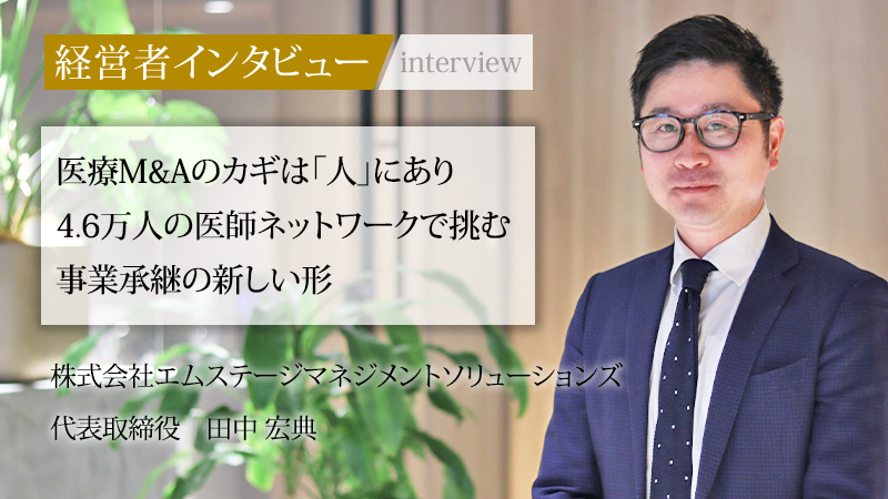 日本の地域医療を支えてきた開業医の高齢化が、待ったなしの局面を迎えている。後継者不在による黒字廃業は、地域から医療機能を喪失させることを意味する。この社会課題に対し、医療・ヘルスケア領域に特化したM&A支援で解決の道筋をつけているのが、株式会社エムステージマネジメントソリューションズだ。同社を率いる代表取締役の田中宏典氏は、医療機関の事業承継において「財務上のマッチングだけでは本質的な解決にならない」と断言する。4.6万人の医師ネットワークとグループの総合力を武器に、医療経営の難題に挑む田中氏に、その独自の戦略と今後の展望を聞いた。