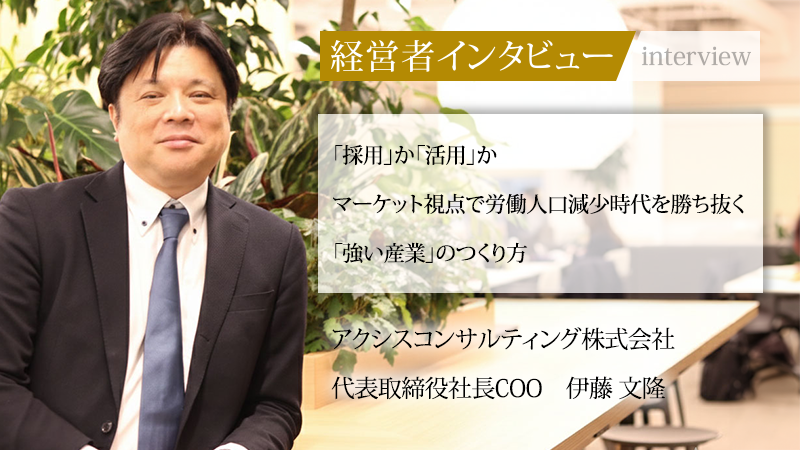ハイエンド人材の紹介事業と、フリーランスコンサルタントのスキルシェア事業を両輪で展開するアクシスコンサルティング株式会社。同社の強みは、常に市場の変化を捉えるマーケットインの発想にある。企業の課題に対し、人を採用するのか、外部の知見を活用したプロジェクトを組成するのか、その根本から問い直し、最適な解決策を提示する。HR企業の枠を超え、企業の成長に伴走する独自のビジネスモデルはどのように生まれたのか。代表取締役社長COOの伊藤文隆氏に、そのキャリアの原点から事業の展望まで話を聞いた。