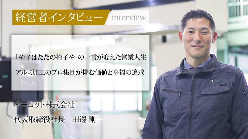精密なアルミ型材加工を軸に、オフィス家具から鉄道車両部品まで幅広い「ものづくり」を支えるイーコット株式会社。代表取締役の田邊剛一氏は、かつてオフィスメーカーで最年少係長に抜擢され、9年間で4度のトップセールスを記録した「営業のプロ」だった。華やかなキャリアを捨て、未経験の製造現場へ飛び込んだ同氏が、泥臭い試行錯誤の末に辿り着いた組織のあるべき姿とは。単なる作業ではない「働く」ことの本質と、全社員の物心両面の幸福を追求する組織論に迫る。