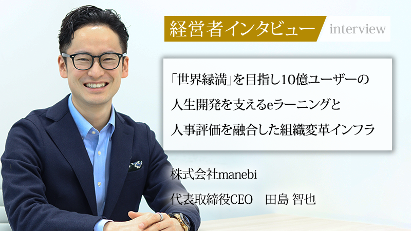 「世界縁満(人と人が良縁で繋がる)」を掲げ企業の組織文化を変革する「伴走支援のインフラ」を提供する株式会社manebi(以下、マネビ)。eラーニングプラットフォームと人事評価コンサルティングを融合させた独自の仕組みを展開し、日本の強みである「ものづくり産業」のDX推進や次世代リーダー育成に注力している。今後は本則市場への上場を見据え、東南アジアから「10億ユーザー」へ価値を届けるグローバルな構想も描く。AI時代も代替されない「人の成長」を追求し続ける代表取締役CEOの田島智也氏に、創業の原点から未来への挑戦までをうかがった。