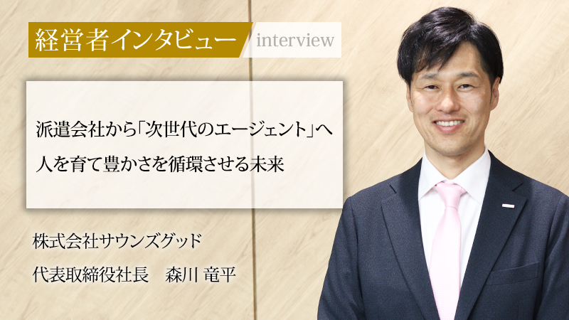 人材派遣事業を軸に、BPO(※1)やHRテック(※2)など多角的に事業を展開する株式会社サウンズグッド。同社は今、2024年に就任した代表取締役社長の森川竜平氏の指揮下で、「第二創業期」とも呼ぶべき抜本的な組織改革の只中にある。「労働集約型の派遣ビジネスは淘汰される」。そう断言し、AI時代における新たな人材会社のあり方を模索する森川氏。改革の原点にある就職氷河期時代の理不尽な体験、そして教育を通じて社員の価値を高めるビジョンに迫った。